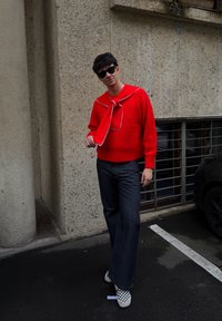 • Νεαρός άνδρας με μαύρα γυαλιά ηλίου, κόκκινο πουλόβερ με δέσιμο στον γιακά, φαρδιά σκούρα παντελόνια και καρό slip-on παπούτσια στέκεται σε αστική οδό.