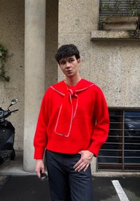 • Νεαρός άνδρας που στέκεται δίπλα σε μια κολώνα κτιρίου, φορώντας ένα φωτεινό κόκκινο πουλόβερ με ένα ταιριαστό κασκόλ δεμένο στο λαιμό, κρατώντας γυαλιά ηλίου στο ένα χέρι.