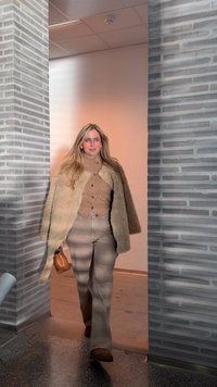 • Γυναίκα που φοράει μπεζ πλεκτή ζακέτα και ζιβάγκο με παντελόνι ψηλόμεσο σε ταμπά, ντυμένη με μια αφράτη κρεμ παλτό, κρατώντας μια τσάντα σε ταμπά χρώμα.