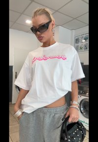 • Λευκό oversize t-shirt με ροζ κείμενο, γκρίζες φόρμες, μαύρα γυαλιά ηλίου. Μηχανές πλυντηρίων στο φόντο, ροζ και άσπρη τσάντα σε μεταλλική πλατφόρμα.