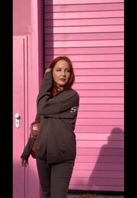 • Άτομο με κόκκινα μαλλιά που φοράει καφέ πουλόβερ με το κείμενο "Stockholm SE, 1991", κρατώντας μια μεγάλη δερμάτινη τσάντα ώμου σε καφέ και βουργουνδί χρώμα.