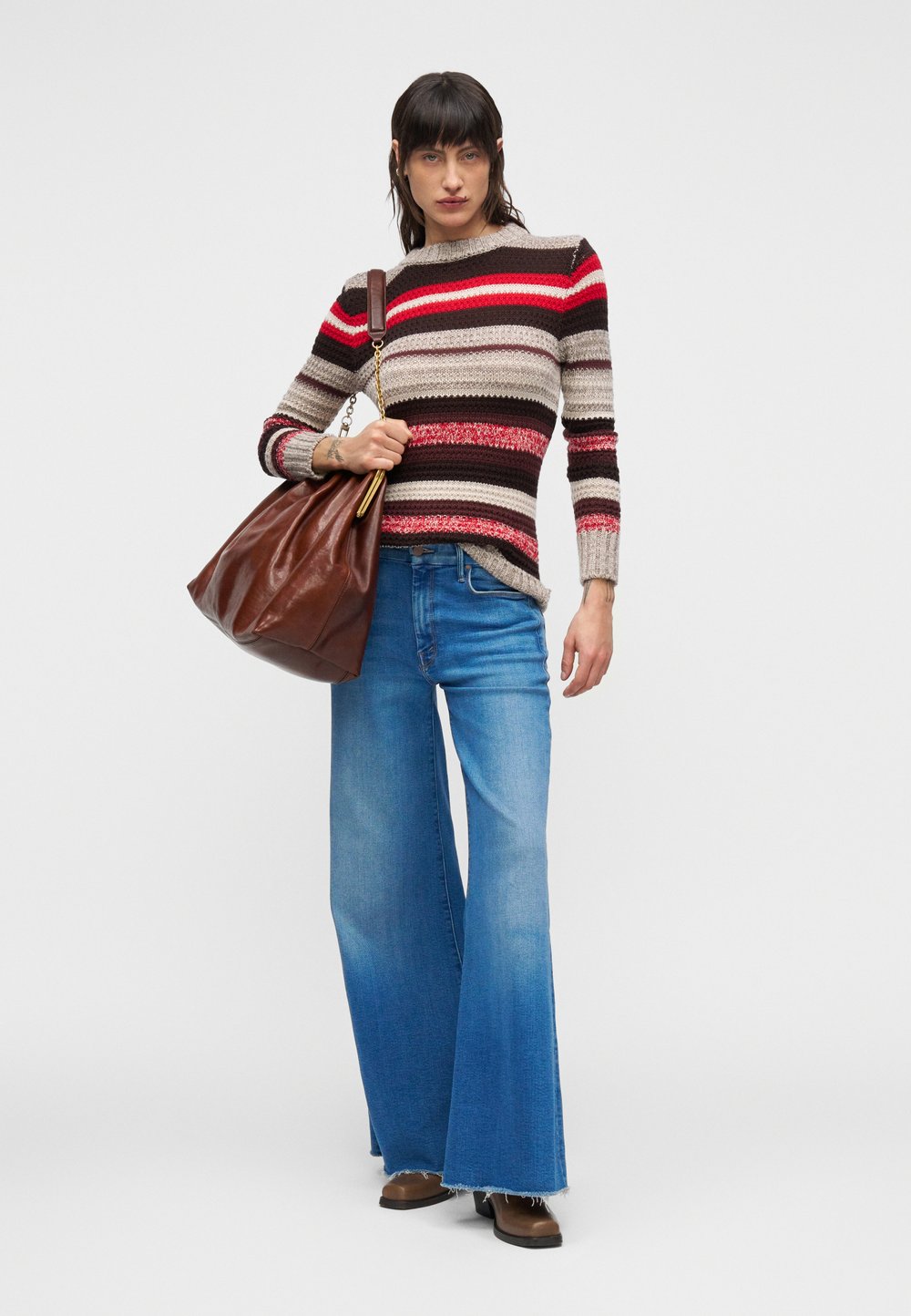 Ριγέ πλεκτό πουλόβερ σε καφέ, κρέμα και ροζ χρώματα; φαρδιά λευκά παντελόνια; καφέ πλατφόρμες; σε αστικό εξωτερικό περιβάλλον.