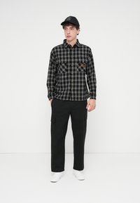 Μαύρο και άσπρο καρό πουκάμισο, μαύρη μπλούζα, γκρι τζιν και μαύρα αθλητικά παπούτσια. Μπέιζμπολ καπέλο με λογότυπο. Στηρίζεται σε λευκό φόντο.