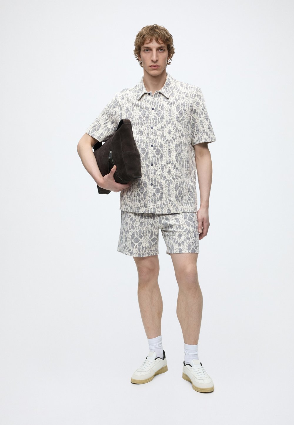 Κοντομάνικο καφέ πουκάμισο με σχέδιο, σκούρο παντελόνι, μαύρα παπούτσια, με αξεσουάρ όπως βραχιόλια και ένα κολιέ. Αστικό φόντο.