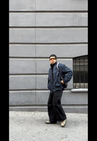 • Άνδρας που φοράει σκούρο μπλε bomber μπουφάν, μαύρο παντελόνι με ευρεία πόδια, μπεζ παπούτσια και κρατάει μια μαύρη τσάντα ώμου, στέκεται μπροστά σε έναν γκρι τοίχο.