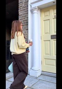 • Γυναίκα με γυαλιά, πολύχρωμο φουλάρι, κίτρινο πουλόβερ και καφέ παντελόνι, κρατώντας ένα φλιτζάνι καφέ και ένα ανοιχτό μπλε τσαντάκι, στέκεται κοντά σε μια κίτρινη πόρτα.