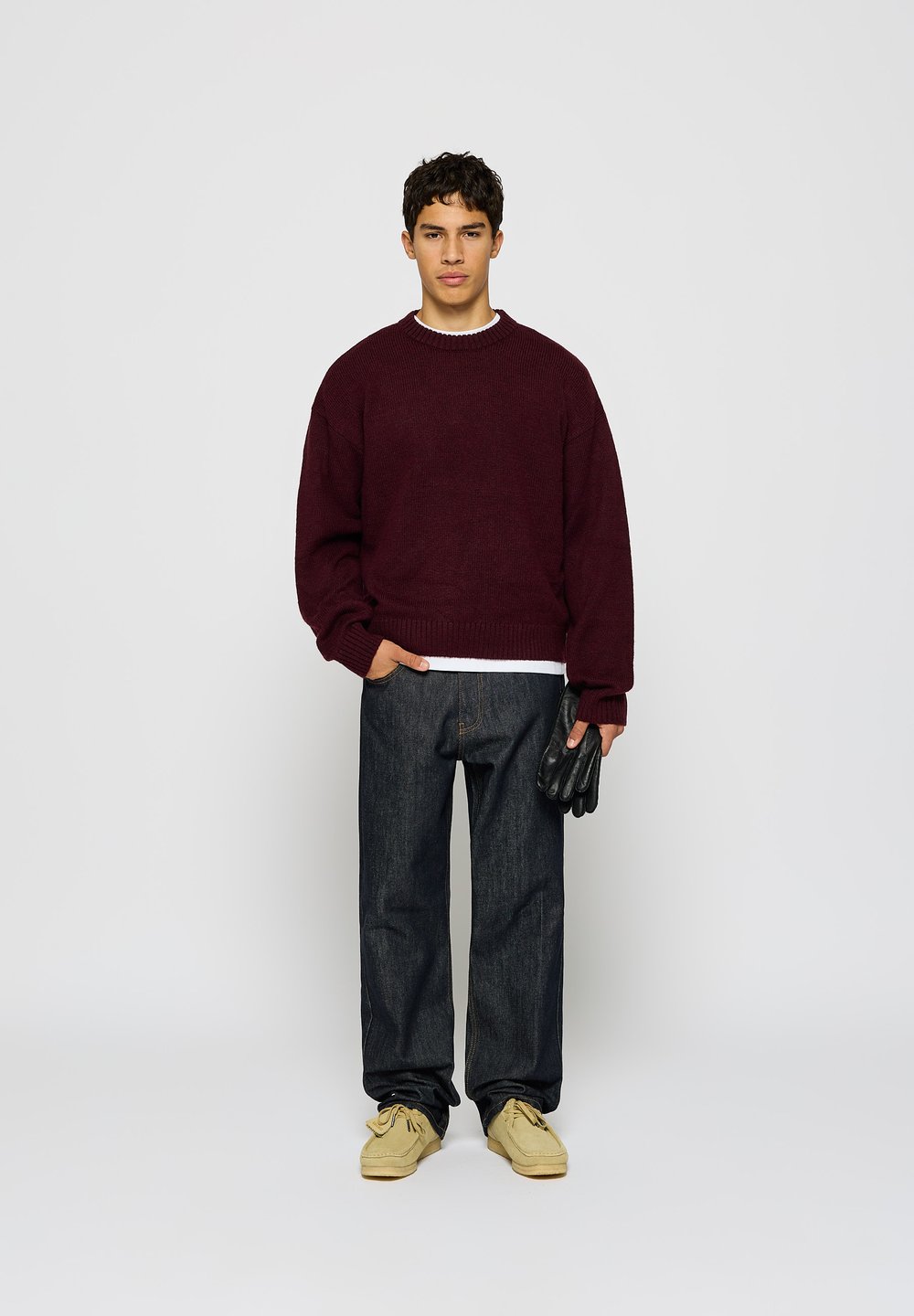 Άνδρας με μαύρο καπέλο, γυαλιά ηλίου, ναυτικό μπουφάν, κόκκινο πουλόβερ και φαρδιά μπλε τζιν στέκεται σε ένα λιθόστρωτο δρόμο μπροστά από ένα μπλε κτίριο.