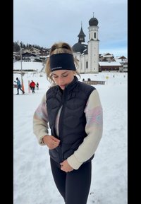 • Νεαρή γυναίκα ρυθμίζει τη μαύρη κορδέλα κεφαλής ενώ κρατάει κόκκινους σκιέρ διαστρεμματικού σκι, ντυμένη με λευκό πουλόβερ, μαύρο γιλέκο και ροζ γάντια, με χιονισμένο φόντο.