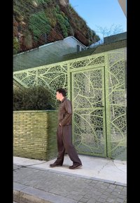 • Νέος άνδρας με καφέ δερμάτινο μπουφάν και μαύρο παντελόνι στηρίζεται σε πράσινο τοιχο με πλακάκια δίπλα σε διακοσμητική πράσινη μεταλλική πύλη.