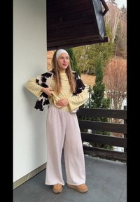 • Νεαρή γυναίκα που φοράει μπεζ παντελόνι, ριγέ μπλούζα και γιλέκο με μοτίβο αγελάδας, στέκεται σε έναν μπαλκόνι με δέντρα και χιόνι στο φόντο, με το ένα χέρι σηκωμένο.
