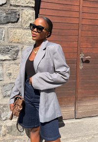 • Γυναίκα με γυαλιά ηλίου, γκρι σακάκι, μαύρο τοπ, σκούρα μπλε σορτς και μαύρα μπαλαρινάκια στέκεται κρατώντας ένα καφέ τσαντάκι δίπλα σε πέτρινο τοίχο και ξύλινη πόρτα.