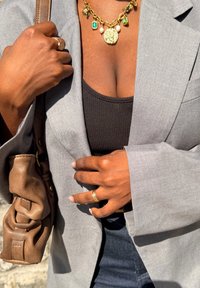 • Άτομο φορά γκρι σακάκι πάνω από μαύρο τοπ, χρυσό κολιέ με πράσινες πέτρες και μενταγιόν, χρυσά δαχτυλίδια και κρατά καφέ δερμάτινη τσάντα.
