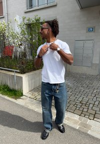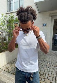 • Άνδρας με γυαλιά ηλίου ρυθμίζει το περιδέραιο έξω κοντά σε κτήριο, φοράει λευκό μπλουζάκι, μπλε τζιν, ρολόι και κλειδιά που κρέμονται από τη θηλιά της ζώνης.