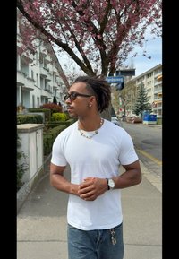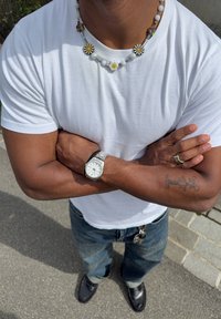 • Άνδρας με σταυρωμένα χέρια, φορά λευκό μπλουζάκι, κολιέ με περιδέραιο από μαργαρίτες, ασημένιο ρολόι χειρός, δαχτυλίδι, τατουάζ στο αντιβράχιο, τζιν και μαύρα παπούτσια.