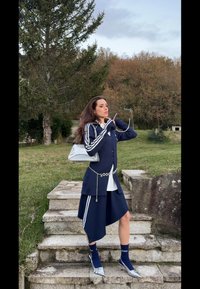 • Άτομο με σκούρο μπλε κοστούμι φούστας με λευκές ρίγες, ασημένια ζώνη αλυσίδα, μεταλλική τσάντα, σκουρόχρωμες κάλτσες Adidas και ασημόχρωμα ψηλοτάκουνα παπούτσια σε εξωτερικό χώρο.