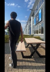 • Ξύλινο τραπέζι πικνίκ με μαύρα μεταλλικά πόδια. Ένα καθισμένο άτομο με μαύρο αμάνικο μπλουζάκι και μαύρα παντελόνια, φορώντας ασημένια αθλητικά παπούτσια. Κόκκινο κουτάκι αναψυκτικού κοντά.