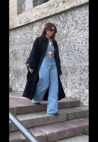 • Γυναίκα φορώντας μαύρο μακρύ παλτό, γκρι κοντό φερμουάρ πουλόβερ, λευκή μπλούζα, μπλε τζιν με φαρδύ πόδι, μαύρα παπούτσια και σκούρα γυαλιά ηλίου, που στέκεται μπροστά σε πέτρινο τοίχο.