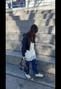 • Γυναίκα που κάθεται σε πέτρινα σκαλοπάτια φορώντας σκούρο μπουφάν, λευκή δαντελένια μπλούζα, μπλε τζιν και μπεζ παπούτσια με μαύρες κάλτσες.