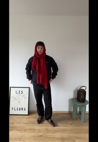 • Κόκκινο φουλάρι με φούντες κρεμασμένο γύρω από τον λαιμό, φορεμένο με μαύρο μπουφάν και παντελόνι. Στο φόντο διακρίνουμε μια λουλουδένια αφίσα και ένα πράσινο τραπεζάκι.