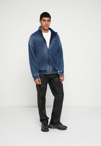 Μπλε φλις τζάκετ με μαύρη πάνελ, κλείσιμο με φερμουάρ και τσέπη με μπαλώματα, συνδυασμένο με σκούρα cargo παντελόνια και μαύρα ορειβατικά παπούτσια.