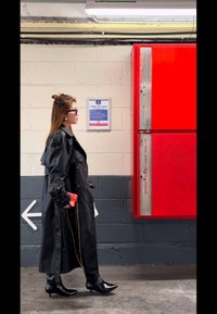 • Γυναίκα με μαύρο δερμάτινο παλτό, λευκό φόρεμα και μαύρες μπότες, στέκεται δίπλα σε κόκκινη ντουλάπα με πυροσβεστικό λάστιχο σε βιομηχανικό διάδρομο.