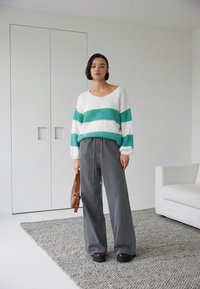 Γυναίκα με ροζ ριγέ πουλόβερ, ανοιχτό μπλε τζιν και πλατφόρμες στέκεται σε λιθόστρωτο δρόμο κρατώντας μπεζ τσάντα, με ιστορικό κτήριο στο φόντο.