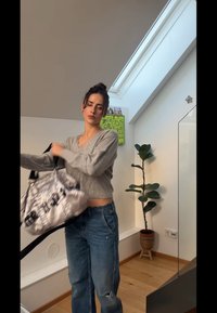 • Γυναίκα με σκοτεινά μαλλιά σε κότσο, φορώντας γκρι κοντό πουλόβερ και μπλε τζιν, κρατώντας ασημένια τσάντα, στέκεται σε ένα φωτεινό δωμάτιο κοντά σε ένα φυτό.