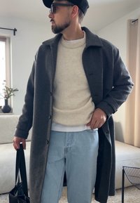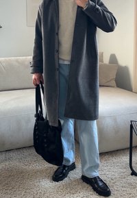 • Άτομο που φοράει γκρι παλτό με κουμπιά, μπεζ πουλόβερ, ανοιχτό μπλε τζιν, μαύρα παπούτσια, κρατώντας μια μαύρη τσάντα ώμου, στέκεται πάνω σε χαλί σε σαλόνι.