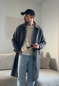 • Άνδρας με μαύρο καπέλο, γκρι παλτό, κρεμ πουλόβερ και ανοιχτό μπλε τζιν, κρατώντας γυαλιά ηλίου, στέκεται σε ένα μινιμαλιστικό σαλόνι.