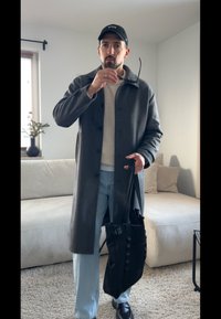 • Άντρας που φοράει γκρι παλτό, κρεμ πουλόβερ, ανοιχτό γαλάζιο τζιν, μαύρο καπέλο και γυαλιά ηλίου, κρατώντας μαύρη τσάντα σε ένα μοντέρνο καθιστικό.