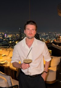 • Άνδρας με λευκό κοντομάνικο πουκάμισο κρατά ποτήρι κοκτέιλ με σκούρο ποτό, στεκόμενος μέσα σε εσωτερικό χώρο με αστικά φώτα ορατά μέσα από το παράθυρο πίσω του.