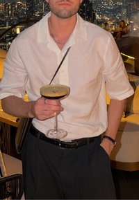 • Άνδρας με λευκό πουκάμισο και μαύρο παντελόνι κρατά ποτήρι κοκτέιλ σε φωτισμένο μπαρ στη στέγη με σκηνικό πόλης τη νύχτα.