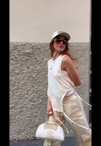 • Λευκή αμάνικη μπλούζα με συγκεντρωμένη λεπτομέρεια στο πλάι, ανοιχτό μπεζ παντελόνι, λευκό καπέλο με πορτοκαλί κείμενο, σκούρα γυαλιά ηλίου, στρωματοποιημένα κολιέ.