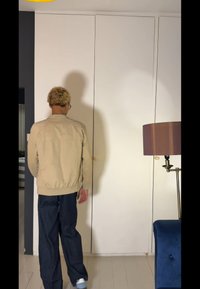 • Άνδρας που φοράει μπεζ μπουφάν πάνω από λευκό τοπ Versace χωρίς μανίκια και σκούρο μπλε ψηλόμεσο παντελόνι, στέκεται με τα χέρια πίσω από την πλάτη.