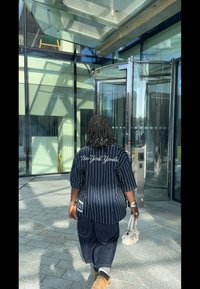• Μπλε πουκάμισο με ρίγες πάνω από λευκό πουκάμισο, σκούρες τζιν culottes και λευκή τσάντα. Υφασμάτινα μαλλιά, στρωματοποιημένα κοσμήματα και κυκλική είσοδος.