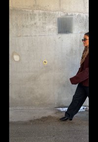 • Γυναίκα που περπατά δίπλα σε τσιμεντένιο τοίχο, φορώντας γυαλιά ηλίου, σκούρο καφέ μπουφάν, φαρδιά μαύρη παντελόνια, μαύρες μπότες και κρατώντας μεγάλη πλεκτή μπορντό τσάντα.