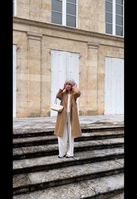 • Γυναίκα κατεβαίνει πέτρινα σκαλοπάτια έξω από μπεζ κτίριο με κλειστά παντζούρια, φορώντας καμηλό παλτό, άσπρο παντελόνι, πλεκτό πουλόβερ, γούνινο καπέλο και αθλητικά παπούτσια.