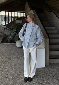 • Γυναίκα με ανοιχτό μπλε σακάκι με κουμπιά, λευκό παντελόνι και γυαλιά, στέκεται σε εσωτερικό χώρο κοντά σε σκάλες από σκυρόδεμα με φυτά και πινακίδες στο παρασκήνιο.
