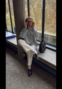 • Γυναίκα που φοράει φαρδιά ανοιχτογκρι ζακέτα, λευκό παντελόνι, λευκές κάλτσες και μαύρα μοκασίνια, καθισμένη δίπλα σε μεγάλο παράθυρο με δέντρα έξω.