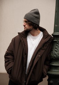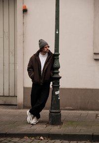 • Καφέ φουσκωτό μπουφάν, λευκό μπλουζάκι από κάτω, γκρι καπέλο, στέκεται δίπλα σε μια πράσινη κολώνα φωτισμού, με φόντο μια υφασμένη τοίχο.