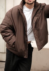 • Καφέ φουσκωτό μπουφάν με ψηλό γιακά, φερμουάρ και κουμπιά με πιέτα; φορεμένο πάνω από ένα λευκό κοντό μπλουζάκι; προβαλλόμενο με χαλαρή εφαρμογή.