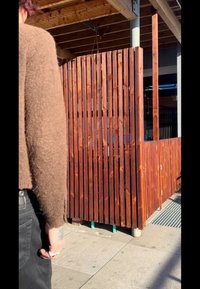 • Άτομο με τατουάζ που φορά γκρι καπέλο, λευκό μπλουζάκι με κόκκινο περίγραμμα, φαρδιά μαύρα παντελόνια και ζώνη με αλυσίδα, στέκεται μπροστά σε ξύλινο τοίχο με ξύλινες σανίδες κάτω από το ηλιακό φως.