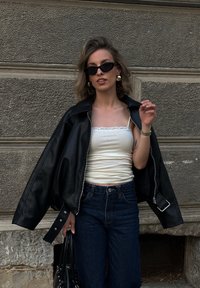 • Γυναίκα που φοράει μαύρα γυαλιά ηλίου, μεγάλα σκουλαρίκια, λευκή μπλούζα, μαύρο δερμάτινο μπουφάν κρεμασμένο στους ώμους, σκούρα τζιν, κρατώντας μαύρη τσάντα κοντά σε πέτρινο τοίχο.