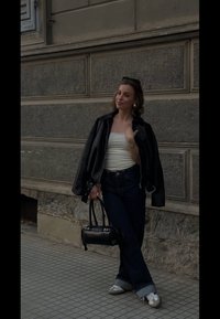 • Γυναίκα με μαύρο δερμάτινο μπουφάν πάνω από λευκό τοπ, σκούρα ευρεία τζιν, κρατάει μαύρη τσάντα, περπατά σε πλακόστρωτο πεζοδρόμιο δίπλα σε πέτρινο τοίχο.