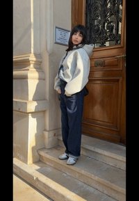 Γυναίκα με κοντά μαύρα μαλλιά, φορώντας μαύρο δερμάτινο μπουφάν, μαύρο πουλόβερ, φαρδιά σκούρα τζιν και λευκά αθλητικά παπούτσια, που στέκεται μπροστά σε μια διακοσμημένη πόρτα.
