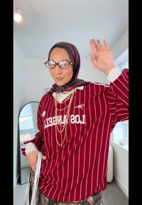 • Μαρόν ριγέ φαρδύ πουλόβερ με κείμενο "LOS ANGELES", στρωματωτές χρυσές και μαργαρίτες αλυσίδες και μοτίβο χιτζάμπ. Μεγάλα στρογγυλά γυαλιά.