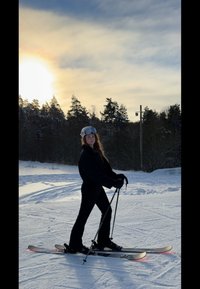 • Γυναίκα με μαύρη στολή σκι που φορά κράνος και γυαλιά σκι στέκεται στα σκι πάνω στο χιόνι, κρατώντας μπαστούνια σκι, με δάσος και το ηλιοβασίλεμα στο φόντο.