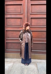 • Γυναίκα με καφέ δερμάτινο παλτό-τζάκετ, γούνινο καπέλο και παντελόνι με φαρδιά πόδια στέκεται μπροστά σε μεγάλα ξύλινα πόρτες με χρυσές λεπτομ�έρειες, κρατώντας μια τσάντα.
