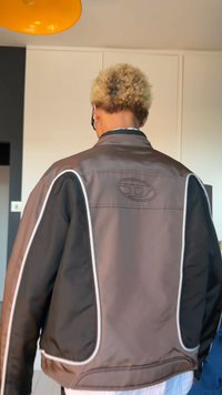 • Άτομο που φοράει καφέ και μαύρο μπουφάν με φερμουάρ πάνω από λευκό πουκάμισο με ρίγες, σκούρο παντελόνι και κόκκινο κολιέ με χάντρες.