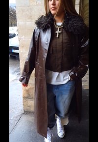 • Άτομο που φορά καφέ δερμάτινο παλτό με γούνινο γιακά, κομμένο καφέ καρό πουκάμισο, ανοιχτό μπλε baggy τζιν και λευκά sneakers ψηλού άξονα περπατά σε �βρεγμένο πεζοδρόμιο.